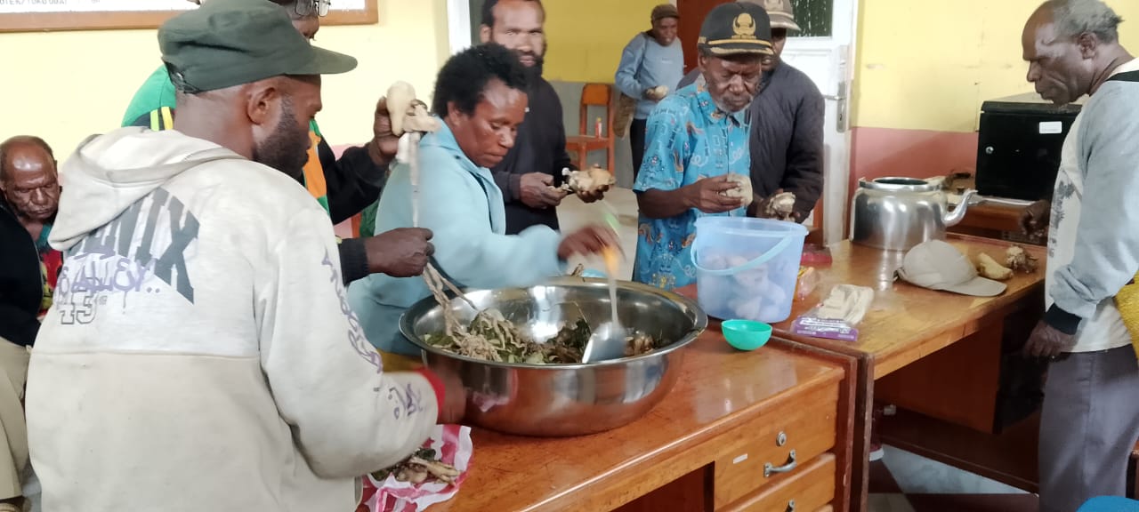 Makan bersama tersebut diwarnai suasana akrab dengan tawa dan percakapan ringan antara kepala distrik dan para staf. Hidangan lokal seperti ubi rebus, ikan bakar, dan sayur daun pepaya tersaji di atas meja panjang sederhana, mencerminkan semangat kesederhanaan dalam pelayanan.