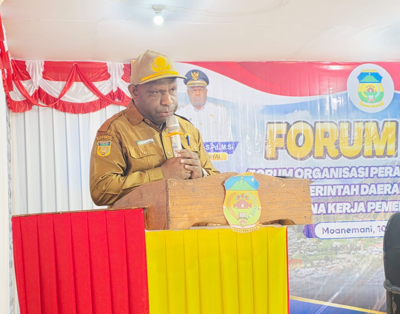 Momen Kepala Bappeda Litbang Dogiyai, Yakobus Dogomo, S,s memberikan sambutan pada Forum Organisasi Perangkat Daerah di Moanemani, Kabupaten Dogiyai. - [Dok Humas Pemda Dogiyai]