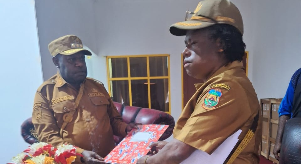 DOGIYAI, JELATANEWSPAPUA.COM – Bupati Dogiyai, Yudas Tebai, S.Pd, M.Si, resmi menunjuk Albertina You, S.Si sebagai Sekretaris Dinas Perpustakaan dan Arsip Daerah Kabupaten Dogiyai. Penyerahan nota dinas dilakukan langsung oleh Bupati di Tokapo, Mauwa, Selasa (22/07).