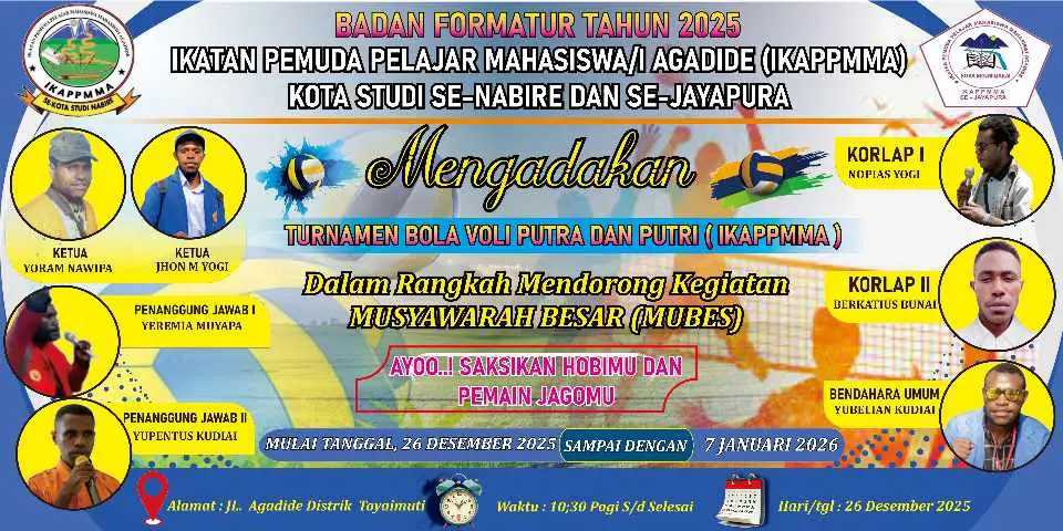 PANIAI, JELATANEWSPAPUA.COM – Badan Formatur Ikatan Pelajar dan Mahasiswa Mahasiswi Agadide (IKAPPMMA) kota studi Jayapura dan Nabire Tahun 2025/2026, sukses gelar  turnamen Bola Voly putra dan putri.