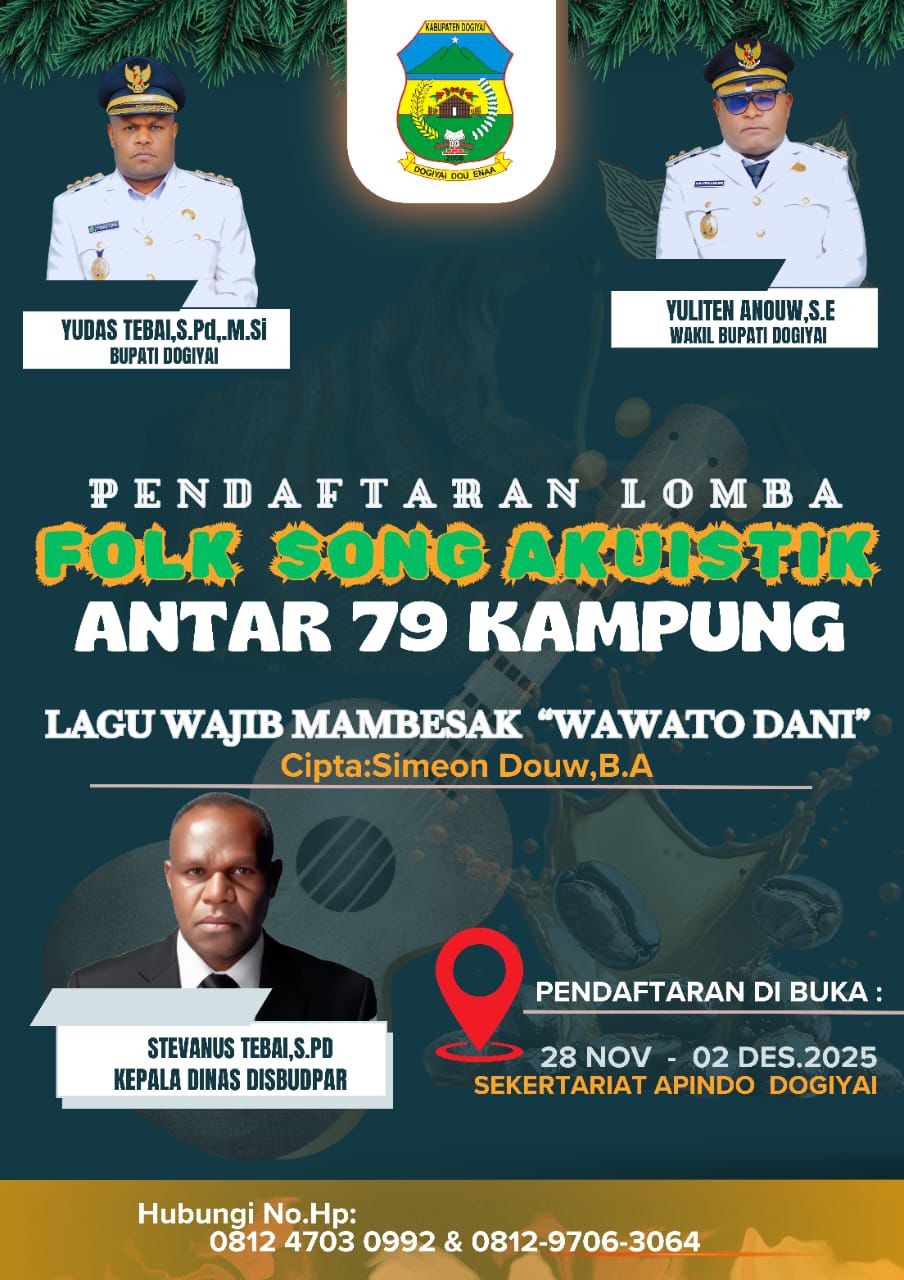 DOGIYAI, JELATANEWSPAPUA.COM-Pemerintah Kabupaten Dogiyai melalui Dinas Pariwisata dan Kebudayaan mulai membuka pendaftaran Lomba Folk Song Akustik Antar 79 Kampung. Kegiatan ini dirancang untuk menghidupkan kembali semangat bermusik di tengah masyarakat Dogiyai.