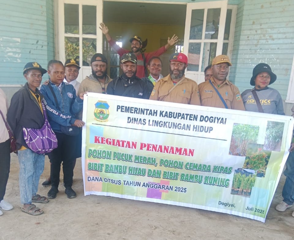 DOGIYAI, JELATANEWSPAPUA.COM — Dinas Lingkungan Hidup (DLH) Kabupaten Dogiyai secara simbolis menyerahkan bibit pohon kepada pihak Distrik Kamu pada Selasa (14/10), bertempat di halaman Kantor Distrik Kamu. Kegiatan ini merupakan bagian dari upaya pelestarian lingkungan dan penghijauan wilayah Lembah Kamu.