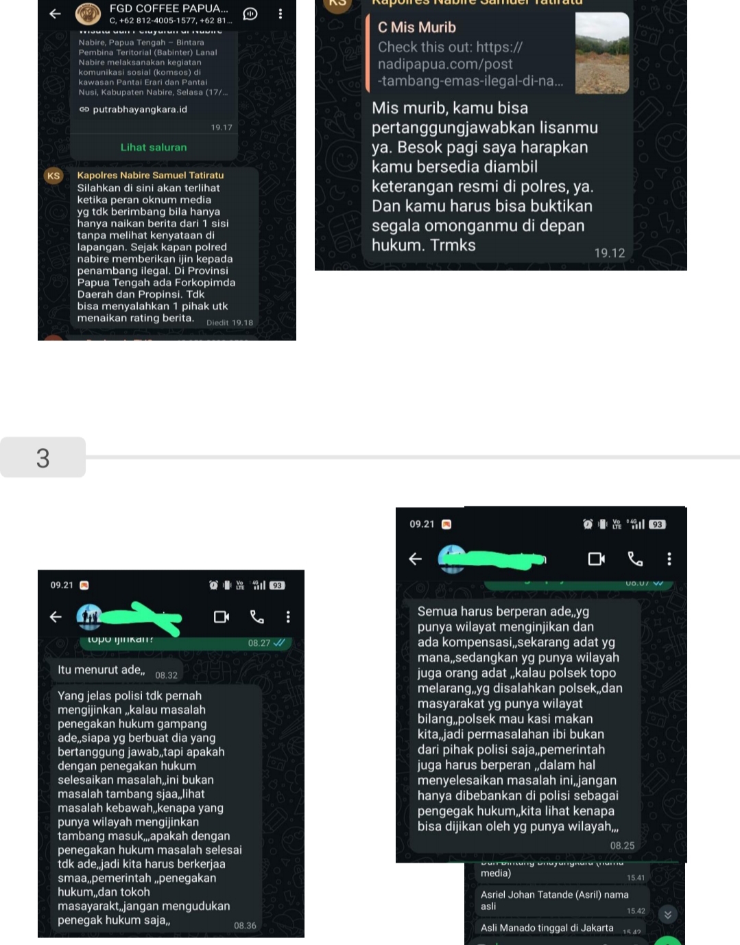 Menurut redaksi, tekanan bermula setelah Mis Murib mempublikasikan berita investigasi berjudul “Tambang Emas Ilegal di Nabire Papua Tengah Kian Masif, Klaim Diizinkan Polisi Setempat.” Puncaknya, Kapolres Nabire, Samuel Tatiratu, mengirim pesan melalui grup WhatsApp yang dinilai sebagai bentuk intimidasi terhadap kerja jurnalistik.