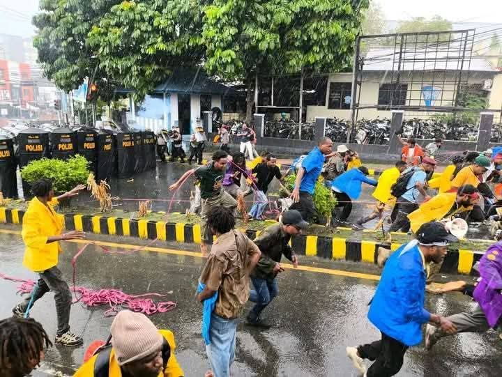 Aksi yang dimulai sejak pukul 08.30 WIT di kawasan Kamkey dan Perumnas 3 Waena itu berlangsung tertib hingga tiba di perempatan Abepura. Namun, menurut laporan Koalisi, situasi berubah ricuh sekitar pukul 11.30 WIT saat aparat melepaskan tembakan gas air mata di tengah hujan deras, memicu kepanikan dan bentrokan di lokasi.