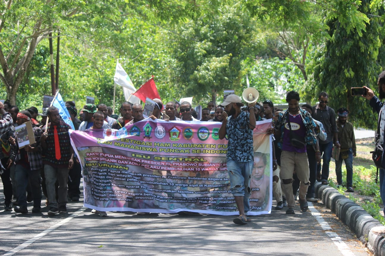 GORONTALO, JELATANEWSPAPUA.COM – Ratusan mahasiswa yang tergabung dalam Tim Investigasi HAM Kabupaten Puncak, Ikatan Pelajar Mahasiswa Puncak, Ikatan Pelajar Mahasiswa Puncak Jaya se-Indonesia, serta mahasiswa Papua di Provinsi Gorontalo, menggelar aksi demonstrasi damai di depan Kantor DPRD Provinsi Gorontalo, Senin (27/4/2026).