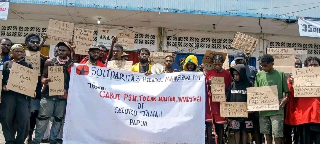 Solidaritas mahasiswa juga menyoroti dampak Proyek Strategis Nasional (PSN) di Kabupaten Merauke. Mereka menilai bahwa penanaman tebu oleh PT. Global Papua, yang didukung oleh Permenco Nomor 8 Tahun 2023 dan Keppres Nomor 14 Tahun 2024, berpotensi melanggar hak asasi manusia masyarakat adat dan merampas tanah ulayat mereka.