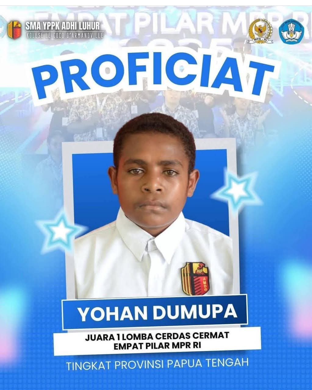 DOGIYAI, JELATANEWSPAPUA.COM – Prestasi membanggakan kembali ditorehkan oleh generasi muda Dogiyai. Yohan Dumupa, siswa SMA YPPK Adhi Luhur, berhasil meraih Juara 1 Lomba Cerdas Cermat Empat Pilar MPR RI tingkat Provinsi Papua Tengah.