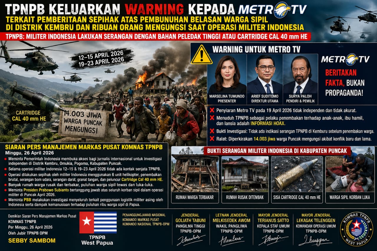 PUNCAK, JELATANEWSPAPUA.COM – Manajemen Markas Pusat KOMNAS TPNPB secara resmi mengeluarkan peringatan (warning) kepada pihak Metro TV terkait pemberitaan yang dinilai sepihak mengenai insiden penembakan yang menewaskan belasan warga sipil di Kabupaten Puncak, Papua Tengah.